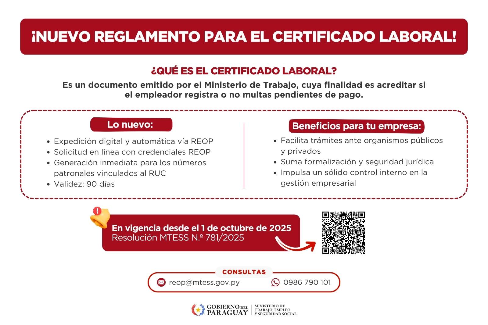 El Ministerio de Trabajo puso en vigencia el nuevo Reglamento para la Expedición del Certificado Laboral, aprobado mediante la Resolución MTESS N.º 781/2025. Con esta disposición, vigente desde el 1 de octubre, la emisión del documento pasa a realizarse de forma digital y automática a través del Sistema de Registro Obrero Patronal (REOP), lo que garantiza mayor agilidad, transparencia y eficiencia en el proceso.