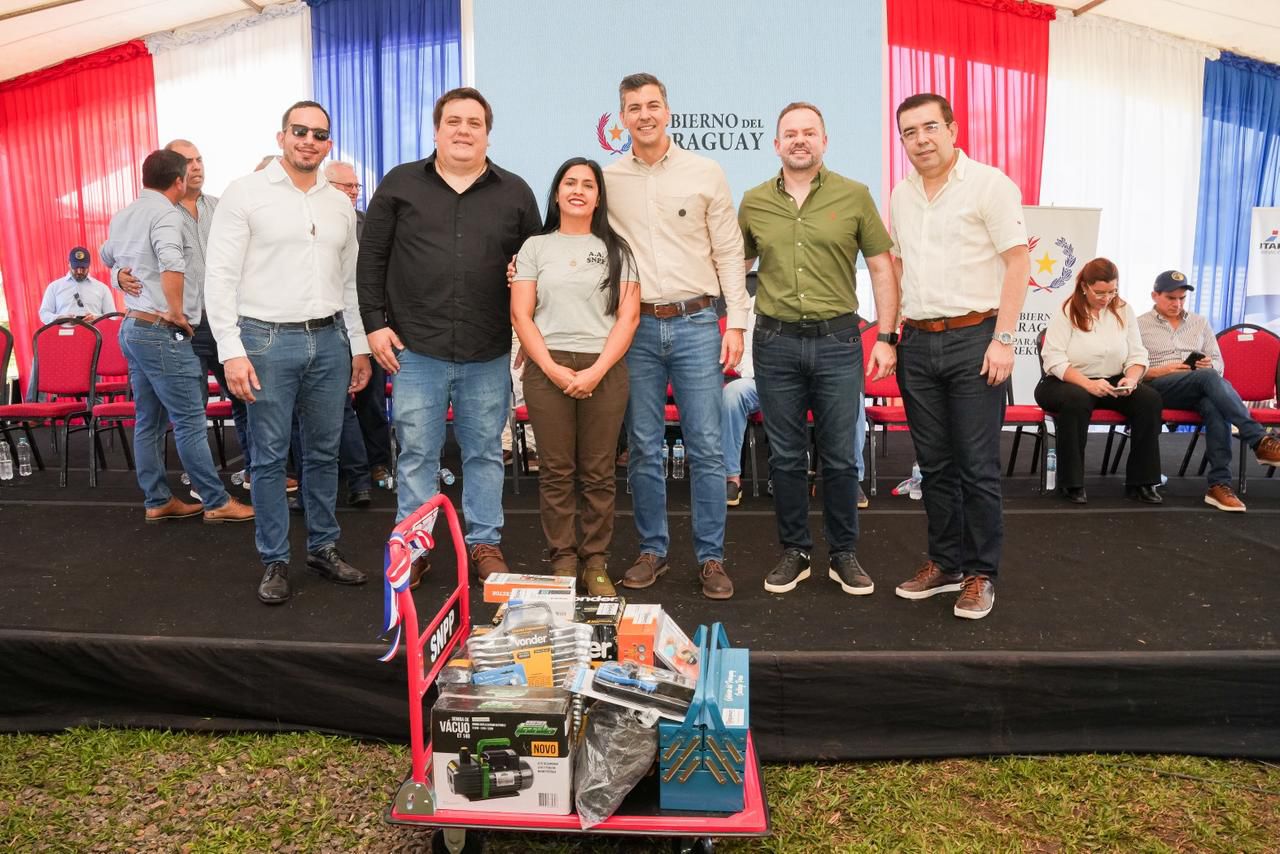 Durante el acto central realizado en la localidad de Paso Yobái, las autoridades acompañaron al jefe de Estado en la entrega de lotes de equipamientos a egresados de los cursos de mantenimiento de aire acondicionado y herrería, en el marco del programa Equipate, impulsado por el SNPP.