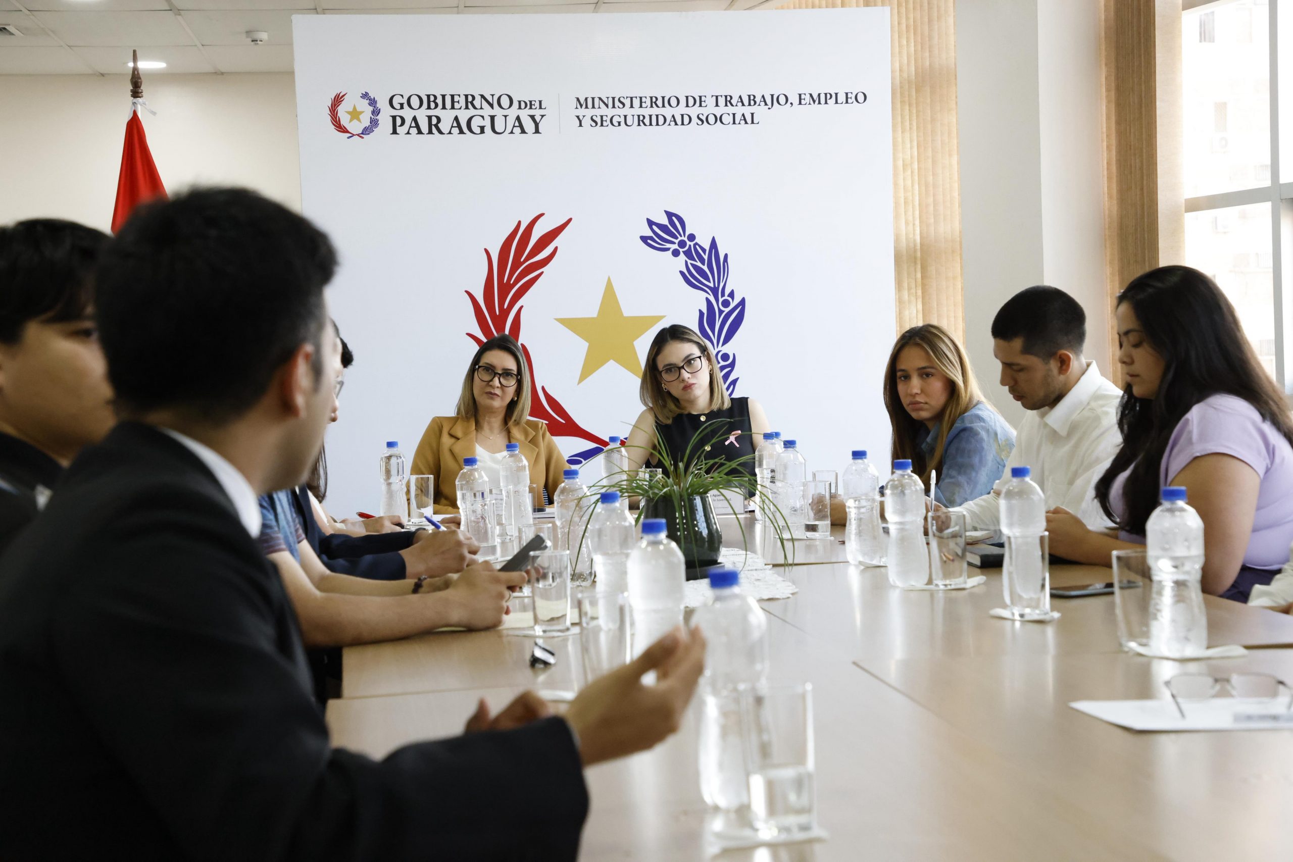 La ministra de Trabajo, Empleo y Seguridad Social, Mónica Recalde, junto con la ministra de la Juventud, Salma Agüero, encabezó un encuentro con representantes de centros de estudiantes de la Universidad Nacional de Asunción (UNA), con el objetivo de avanzar en propuestas que permitan articular el acceso al empleo formal con la continuidad académica.