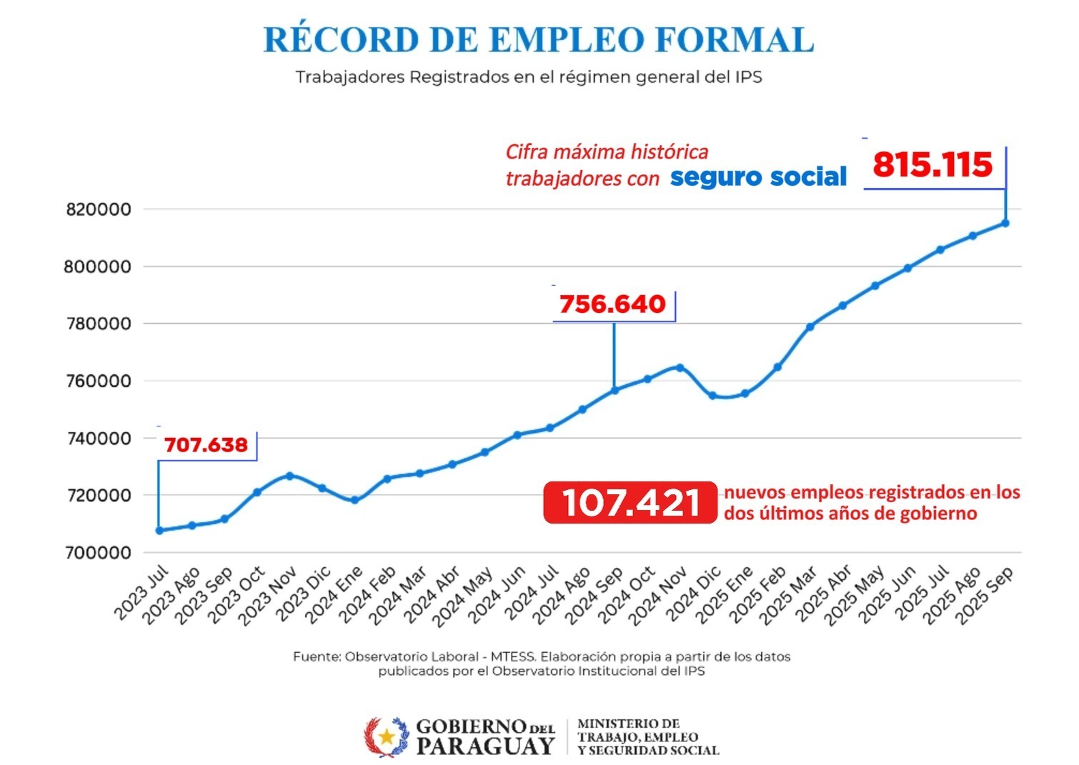 De acuerdo con los registros administrativos del IPS que fueron procesados por el Observatorio Laboral del MTESS, entre julio de 2023 y septiembre de 2025, la cantidad de cotizantes en el régimen general del IPS pasó de 707.638 a 815.115 trabajadores, lo que representa más de 107.000 personas incorporadas a la formalidad en poco más de dos años.