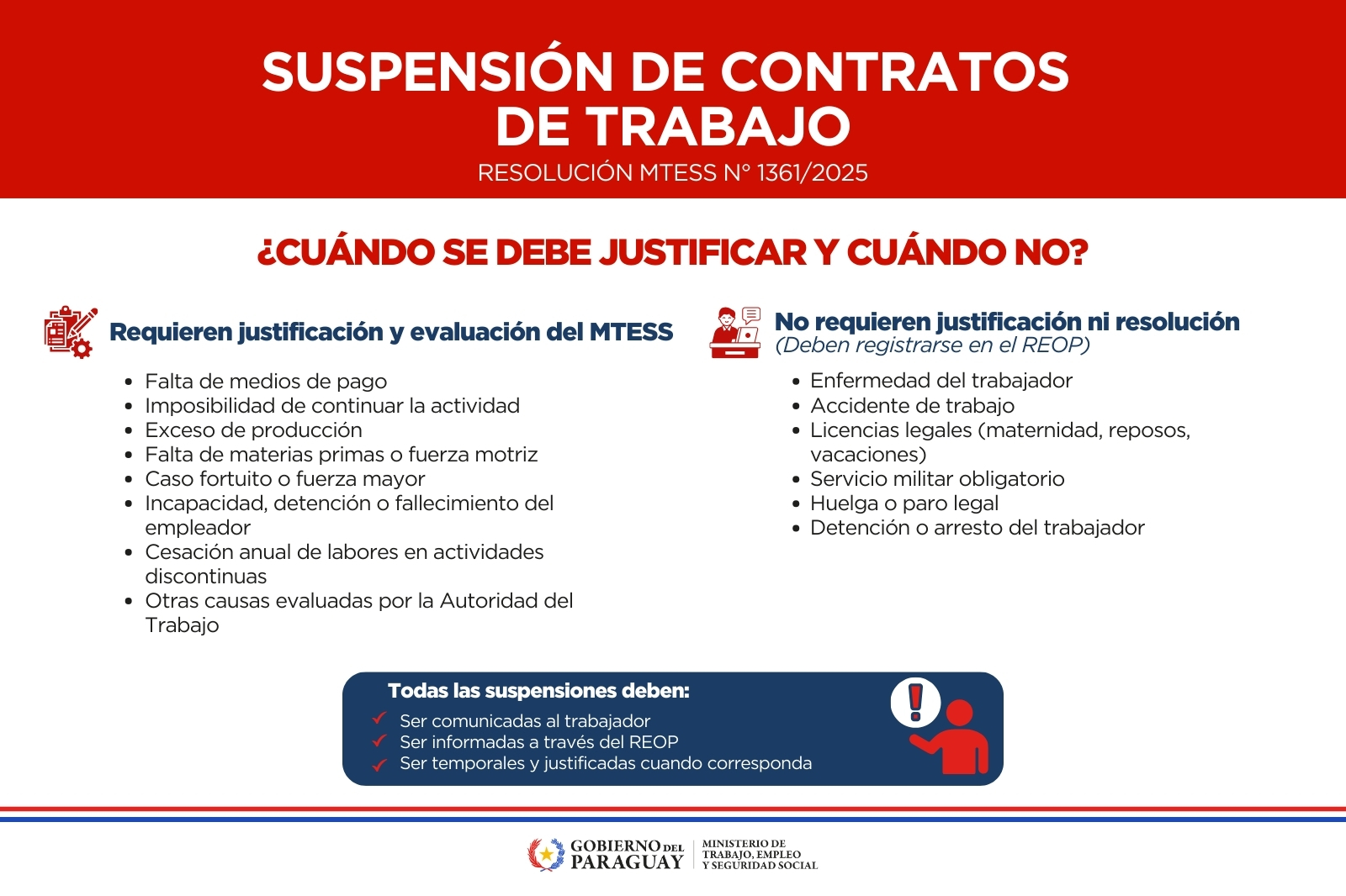 El MTESS enfatiza que toda suspensión debe ser comunicada al trabajador, además de ser informada a través del REOP, garantizando trazabilidad, transparencia y el cumplimiento de los procedimientos laborales correspondientes.